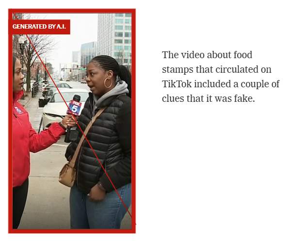 В октябре на TikTok появилось видео, где будто бы женщина даёт интервью телевизионному репортёру о продуктовых талонах — американской госпрограмме помощи малообеспеченным семьям.