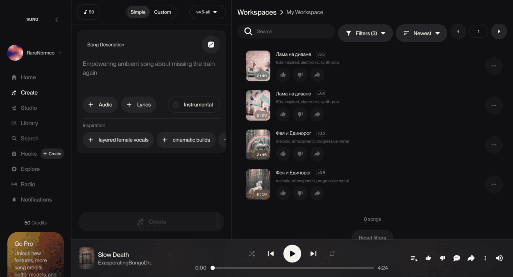 В кастомном режиме можно управлять процессом глубже: задавать структуру песни, писать собственный текст, выбирать стиль вокала, инструменты и степень экспериментальности.