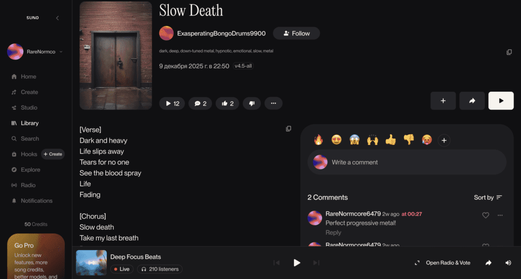 А если нужна музыка для кафе или фона (и не хочется заморачиваться с авторскими правами), в Suno есть радиоволна — её настраивают пользовали с помощью онлайн-голосования.