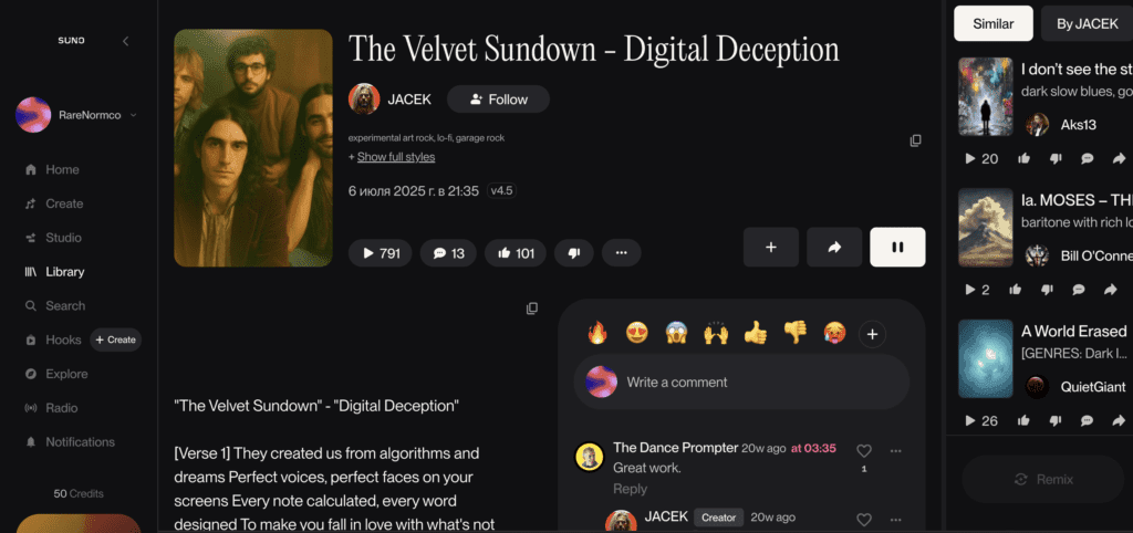 Позже выяснилось, что группы не существует: музыку сгенерировали в Suno, визуальный образ и историю тоже создали с помощью ИИ. Слушатели долгое время не догадывались об этом.