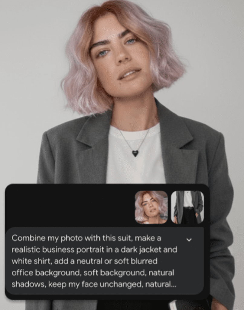 Nano Banana — это ИИ, который объединять изображенияВ отличие от классических text-to-image моделей, он не генерирует человека с нуля по описанию, а аккуратно совмещает реальные снимки: ваше лицо, одежду, фон и освещение.